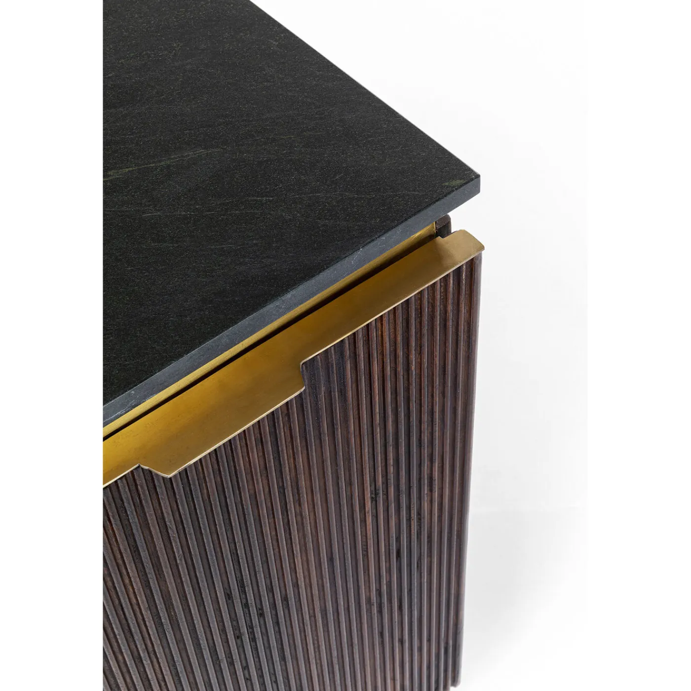 Tout A Ete Pense Dans Les Moindres Details Pour Ce Sideboard Moderne. Ce Meuble De Salon Luxueux Joue Sans Aucun Doute Dans La Cour Des Grands. Le Bois De Manguier Noble,Au Vernis Fonce,S Harmonise Parfaitement Avec Le Plateau De Table En Marbre Fonce Et Les Pieds Metalliques Noirs. Ce Qui Rend Ce Sideboard Incomparable Et Attire L Attention,C Est Le Socle Dore En Laiton Qui Se Trouve Entre Le Plateau Superieur Et Les Facades Striees. Des Compartiments Derriere Les Quatre Portes Avec Deux Etagères Amovibles Assurent Un Espace De Rangement Suffisant. Les Poignees Plates Facilitent L Ouverture Et Rendent Le Sideboard Encore Plus Elegant. Sur Le Plateau En Marbre De Haute Qualite,Vos Objets De Décoration Preferes Trouveront A Coup Sur Une Place Appropriee Dans Le Salon Ou La Chambre A Coucher.