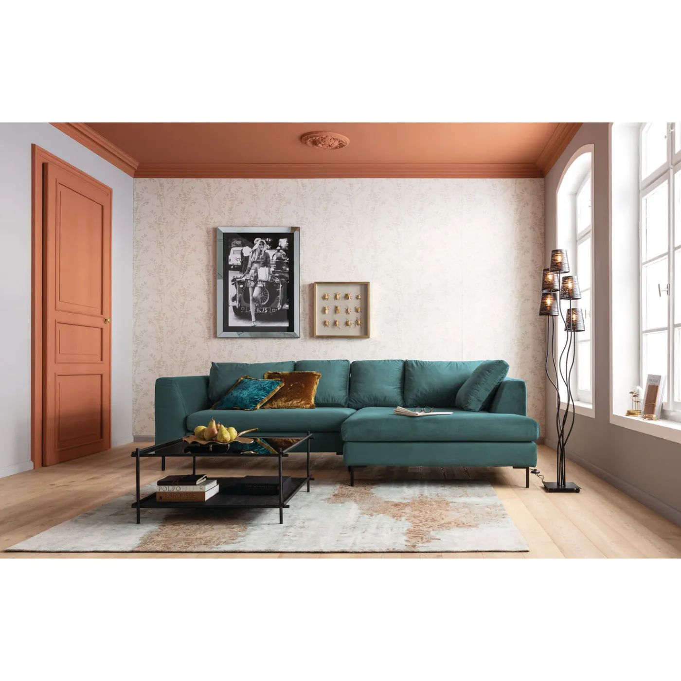 - Modern Corner Sofa With Contemporary Velvet Cover In Petrol And Five Casual Throw Pillows.