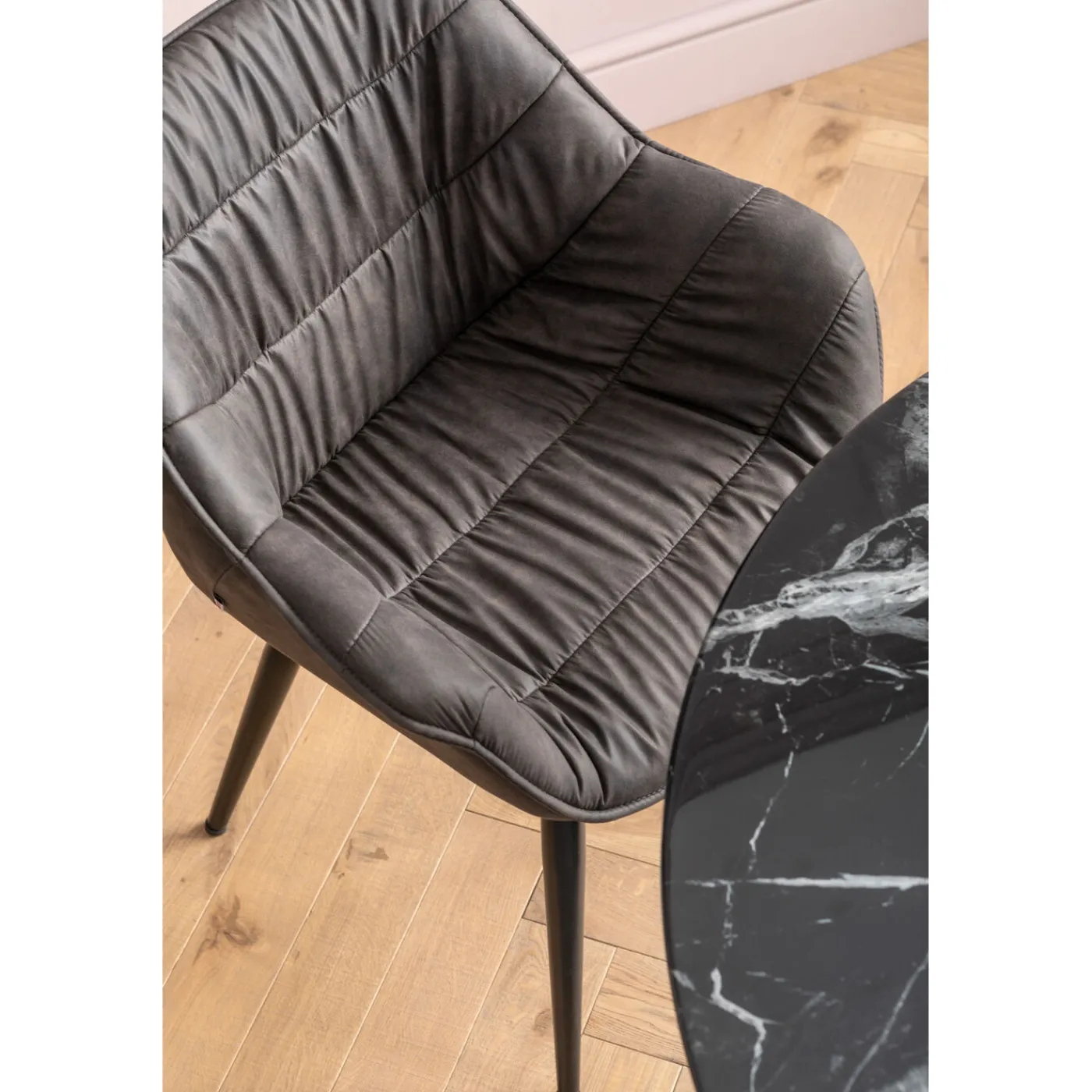 - By The Way,Thelma Is Also Available In Velvety Silver Grey! Quilted Seams,All-Round Piping And Slightly Splayed Black Legs Make Thelma A Designer Chair.