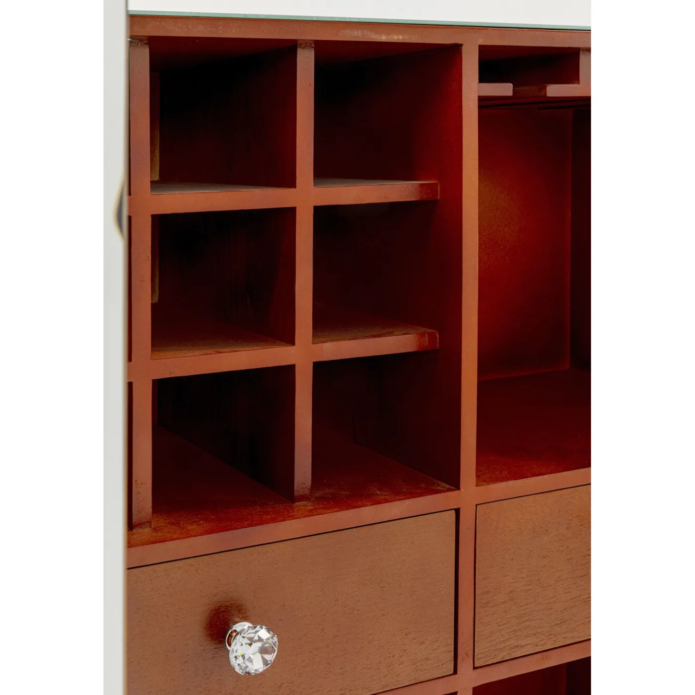 Petit Et Compact,Mais Avec Un Grand Impact,Voila Comment Decrire Le Meuble Bar Luxury. En Ouvrant Ses Deux Portes,C’Est Un Veritable Bar Qui S’Invite Chez Vous. Cinq Compartiments Lateraux Vous Offrent Un Espace Bien Protege Pour Les Petites Bouteilles Et Le Shaker. Dans La Partie Centrale,Vous Trouverez 18 Compartiments Pour Ranger Vos Bouteilles Horizontalement,Des Rails Pour Suspendre Les Verres A Pied Et Deux Tiroirs. Un Espace De Rangement Qui Ne Manquera Pas D Impressionner Vos Invites. Son Petit Plus: Grace A Ses Roulettes,Il Peut Facilement Etre Deplace. L’Extérieur Brillant Contraste Joliment Avec L Interieur Brun Acajou.