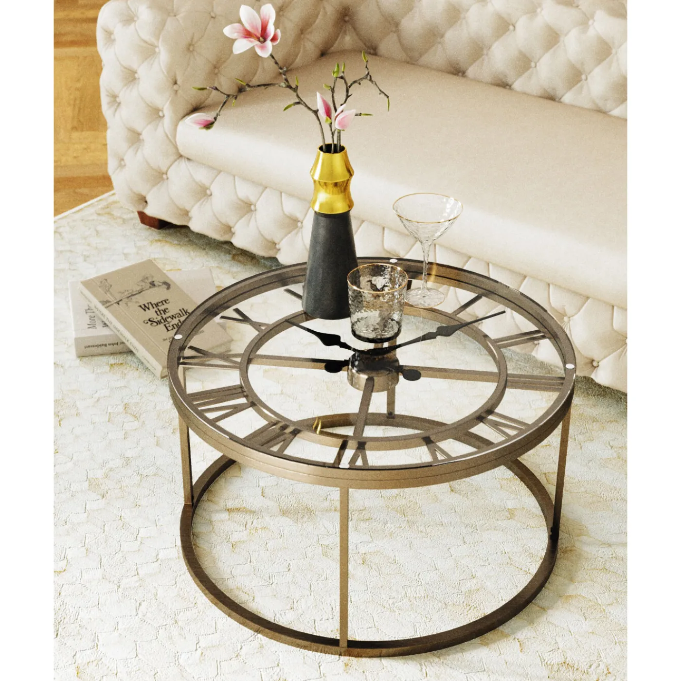 - Materiaux De Haute Qualite : Acier Laque De Couleur Laiton Antique,Un Plateau De Table Clair Ainsi Qu’Un Mouvement D’Horloge A Quartz