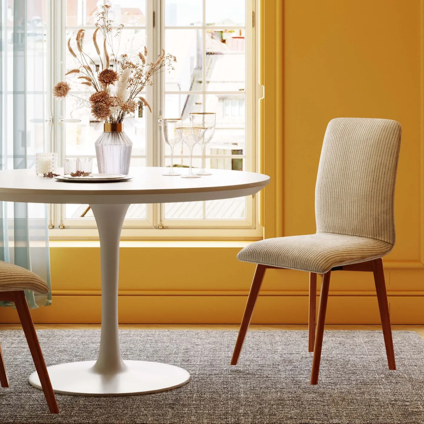 Ce Fauteuil Joue Avec Les Couleurs De La Nature : Le Bois De Chene Et Le Revetement Clair De Couleur Creme Conferent A La Chaise Lara Une Legerete Optique. C Est Une Chaise De Salle À Manger Qui A Le Talent D Etre Polyvalente Dans Tout L Appartement ! Que Ce Soit Dans La Chambre A Coucher Pour Poser Les Vetements,Pour Servir De Bureau Ou De Table De Maquillage Ou Dans L Entree A Cote De La Penderie Pour Mettre Les Chaussures : Avec Ses Couleurs Neutres Et Ses Lignes Epurees,Cette Chaise Rembourree Confortable Fait Bonne Figure Partout.