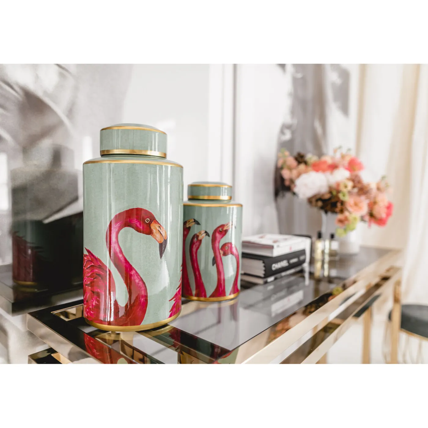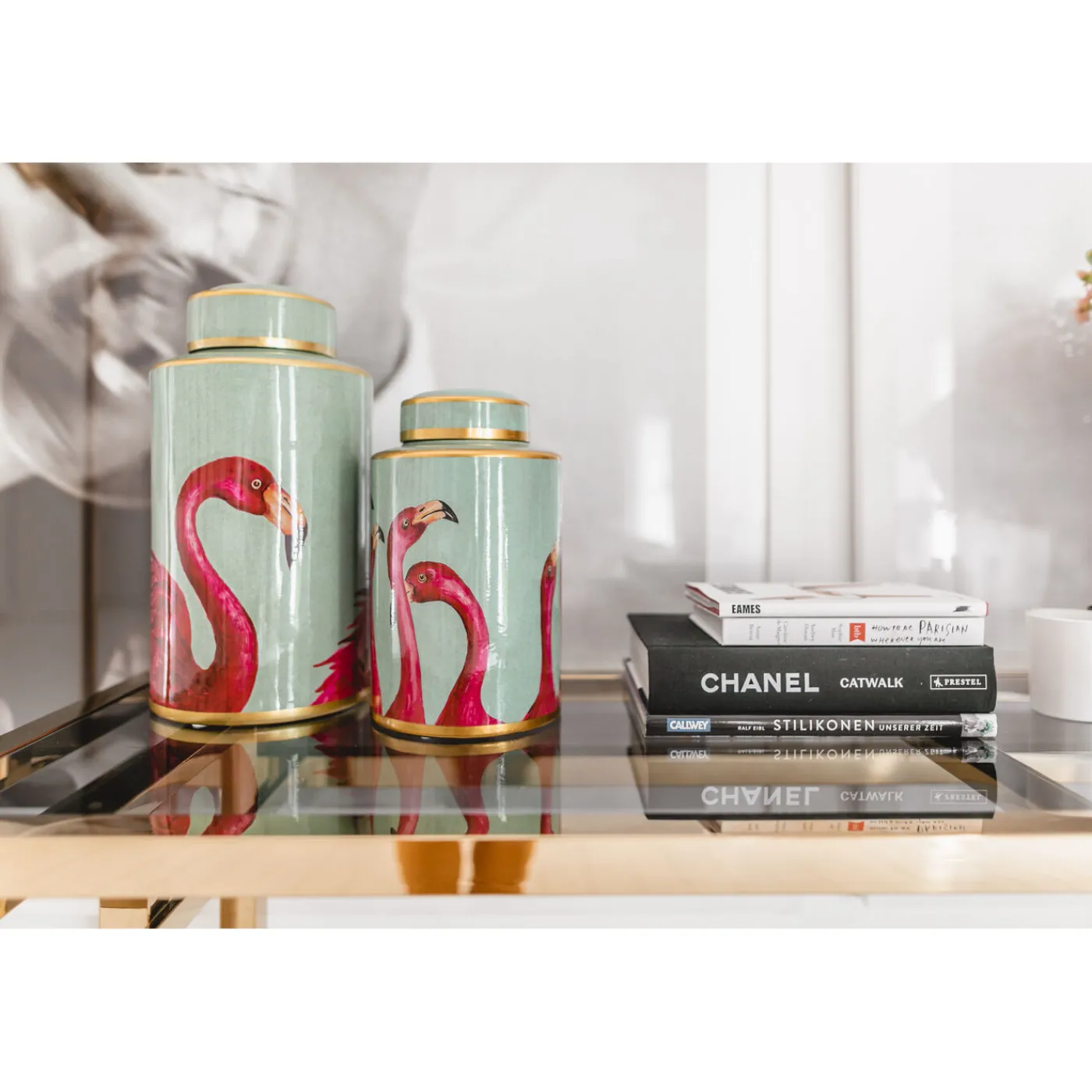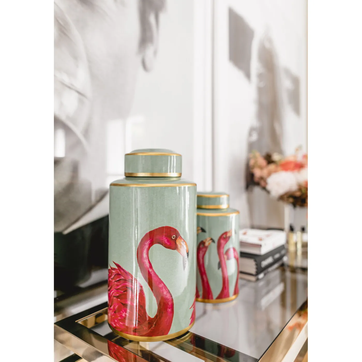 - Fascinating Flamingos-A Hand-Painted Décorative Container In Pink,Mint And Gold.