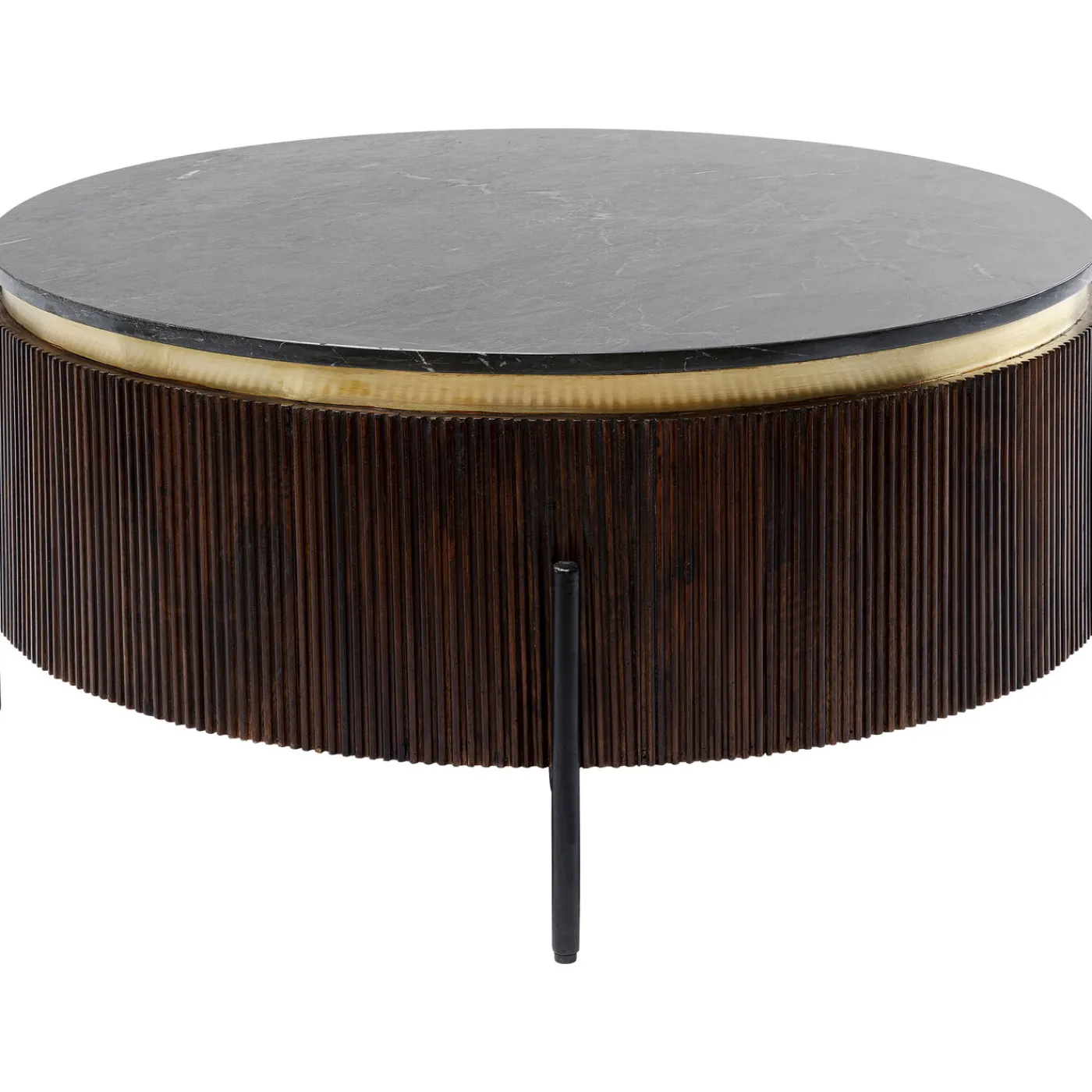 Moderne Et Elegante Avec Une Touche D Extravagance-Ces Caracteristiques S Appliquent Parfaitement A La Table Basse Foncee. Ce Meuble Est Definitivement Un Investissement A Long Terme,Car Les Meubles En Bois Sont Connus Pour Leur Longue Duree De Vie. Seuls Des Materiaux De Premiere Qualite Sont Utilises Pour Ce Bijou : Du Bois De Manguier Massif Laque Fonce,De L Acier Pour Les Pieds,Une Baguette Décorative En Laiton Et Du Marbre Mineral Pour Le Plateau De Table. Les Professionnels De L Amenagement Savent Que Le Jeu Des Differentes Surfaces Rend Les Pieces Particulierement Vivantes. Dans Le Cas De Cette Table Basse,Le Metal Laiton,La Pierre Du Plateau Et Le Corps Orne De Fines Lamelles Forment Un Trio Visuellement Harmonieux. Avec Cette Table Ronde,Vous Donnerez A Votre Salon Un Charme Tout Particulier.